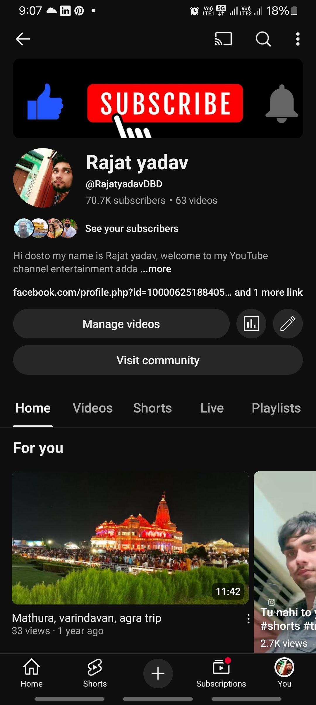Yuvraj Bhere307- Subscribers • 102 Videos • India • hindiSponsorship Price: 500 INR Youtube Channel: https://youtube.com/@yuvrajbhereofficial?si=Daz-2ENhM08wwkj9 Hello Dosto..😎 Mera Naam Hai Yuvraj Bhere Mere Channel Per Shayari Aur Mind... Read More |