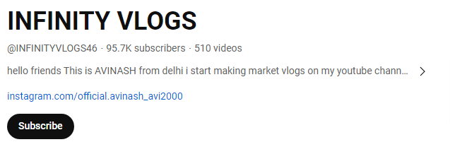 INFINITY VLOGS95.7K Subscribers • 510 Videos • India • hindiSponsorship Price: 30000 INR Youtube Channel: @INFINITYVLOGS46 hello friends This is AVINASH from delhi i start making market vlogs on my y... Read More |